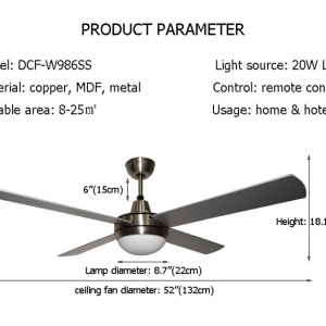 - Quạt trần trang trí có thiết kế đơn giản 5 cánh gỗ làm bằng ván ép với kiểu dáng sang trọng. Quạt trần hiện đại DCF-W986SS hiện đang là mẫu quạt trần được nhiều khách sạn, khu nghỉ dưỡng ưu chuộng.